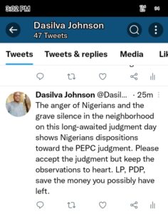 “The anger of Nigerians and the grave silence in the neighborhood on this long-awaited judgment day shows Nigerians dispositions toward the PEPC judgment. Please accept the judgment but keep the observations to heart. LP, PDP, save the money you possibly have left”. Da Silva Said.