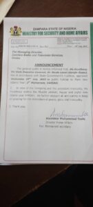The announcement was made on Tuesday through a letter dated 18th July 2023 and signed by Abubakar Muhammad Tsafe, Director Home Affairs, for the Permanent Secretary, Ministry for Security and Home Affiars, Gusau, Zamfara State.