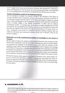 ” We also wish to bring go the attention of the Board of Trustees, the provision of the NAPPS 2023 Constitution and also the defunct Constitution which on article 8(d)(i) circumscribes the meeting of the Board to once a year with the inclusion of the mandatory word “Shall”, it means that the Constitution only recognizes one meeting of the Board of Trustees in a calendar year”.